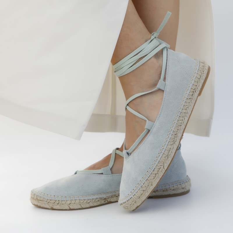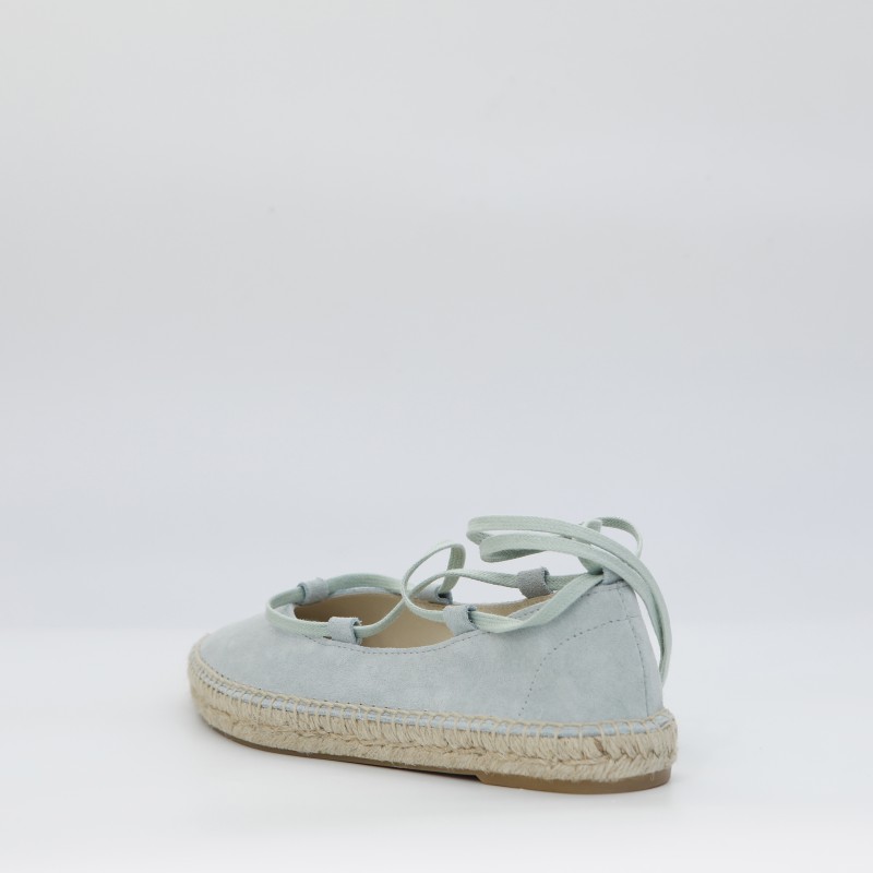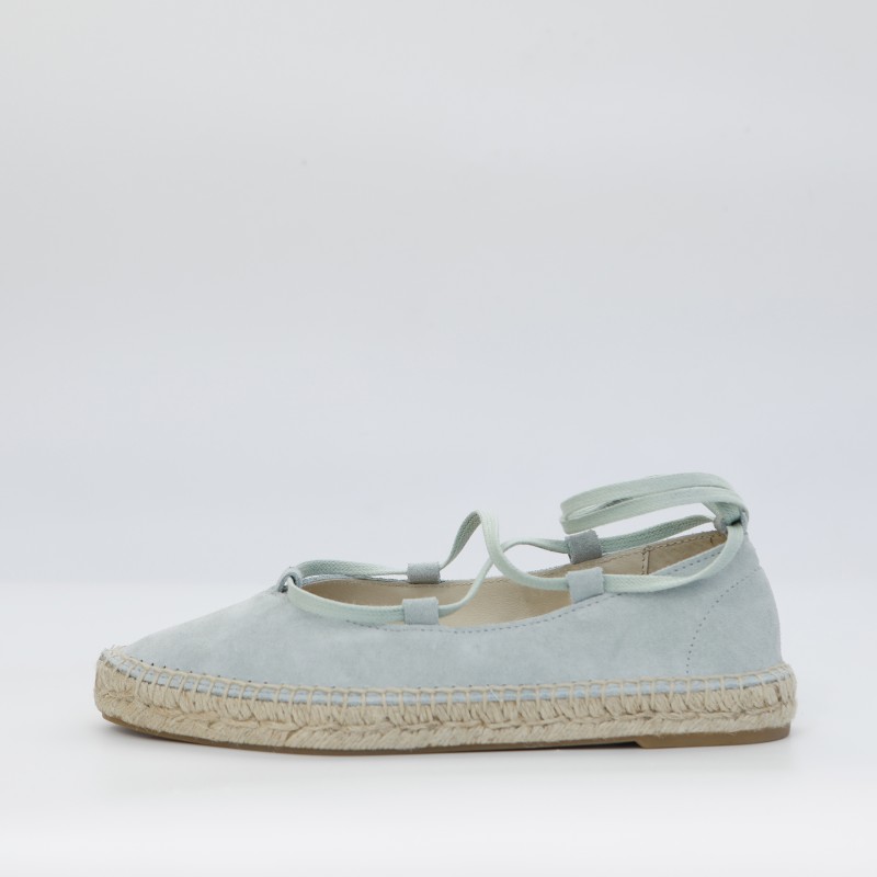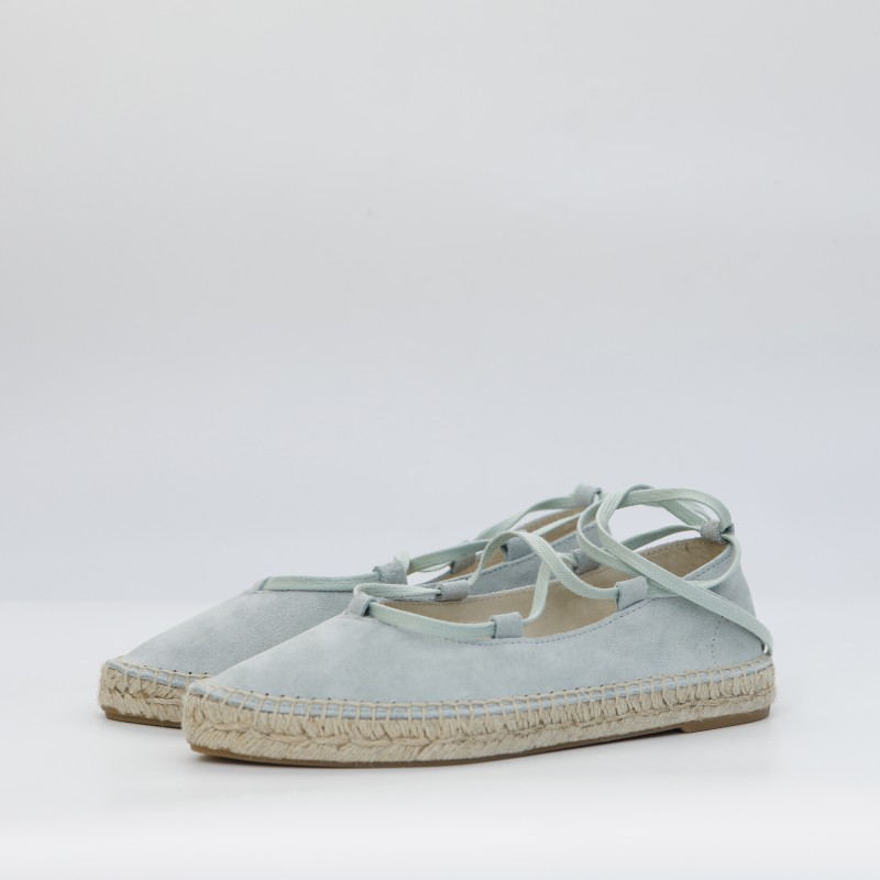 Alpargata plana de serraje color verde menta, con atado de cintas de algodón. Plantilla interior acolcahada con acabado de piel. Suela de trenza de yute natural con capa de goma.