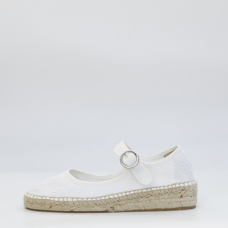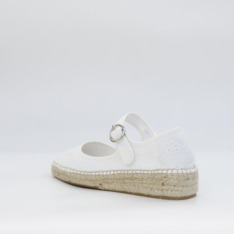 Alpargata tipo merceditas realizada en batista de algodón blanco con bordado de flores. Atado en hebilla plateada. Plantilla aconchada con acabado en suave piel. Suela de trenza de yute acabada en goma